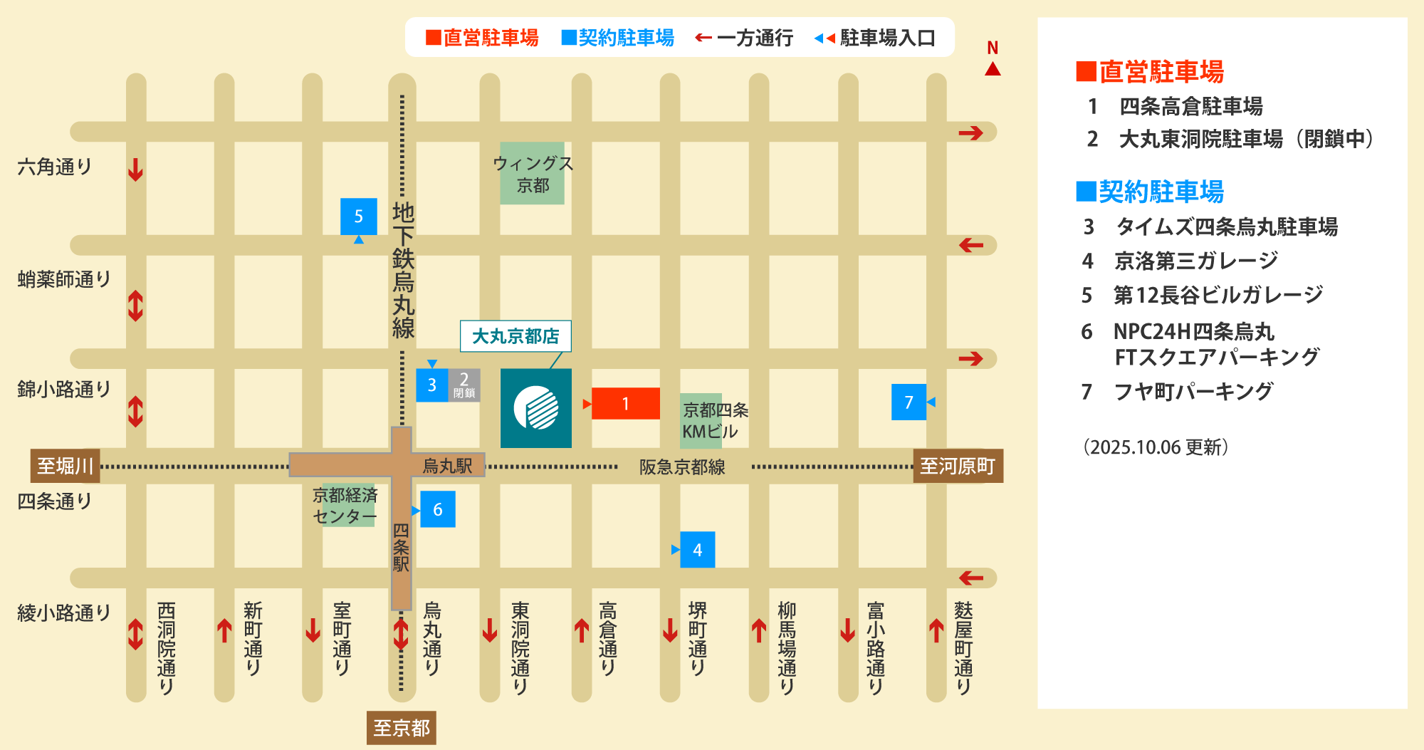 直営駐車場(下図 1.四条高倉駐車場、2.大丸東洞院駐車場 ※リニューアル工事の為閉鎖中)