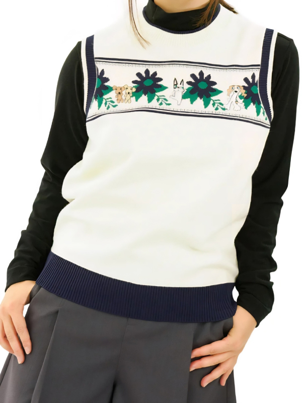 - ベストライクにコーディネートし、レイヤードを楽しむことができるクルーネックベスト。アーム回りもゆったりしているので、厚めのインナーを着ていただいてもゴワゴワしない1着です。フラワーと刺繍されたキャラクターが可愛いです。