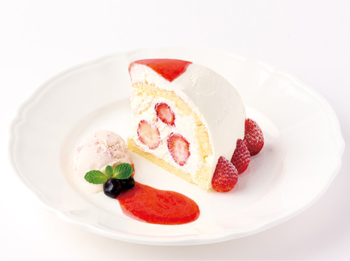 イタリアトスカーナ地方発祥のケーキ「ズコット」旬の苺と口どけのよいクリーム、香り豊かな苺ジェラートを添えた春の一皿です。※写真はイメージです。