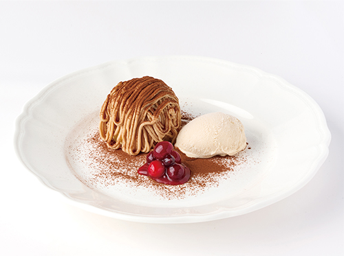 ティラミスに栗の香りを引き立たせた自家製モンブランクリームを絞り、マロングラッセジェラートを添えました。※少量の洋酒を使用しています。※写真はイメージです。