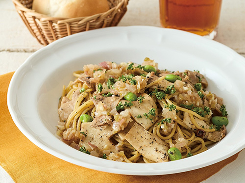 エリンギとポークの黒ゴマソイソースパスタ
