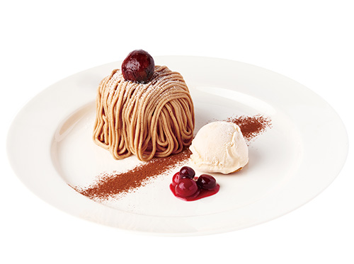 しっとりふんわり食感のモンブランケーキに、栗本来の味わいと香りを楽しめる甘さ控えめのマロングラッセジェラートを添えました。※10月3日(金)からのご提供となります。