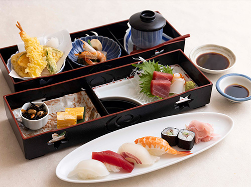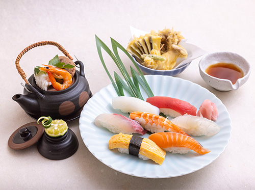 寿司4貫+細巻2貫・先付2種・お造り・炊き合わせ・天ぷら・茶碗蒸し