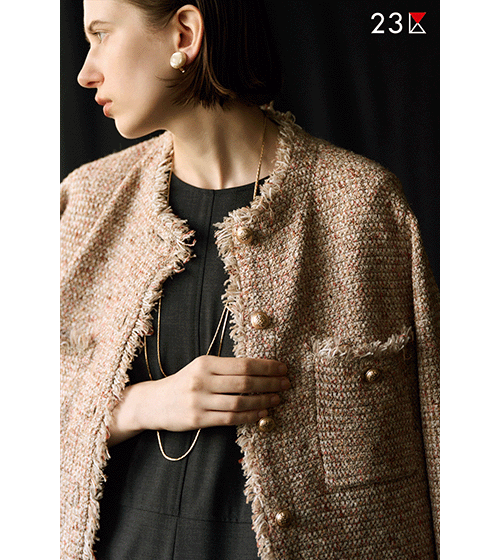 3素材を組み合わせた表情豊かなニットツイード素材のジャケットです。軽さと着心地の良さが特徴で、襟、前立て、袖口に共糸のフリンジを付けてアクセントにしています。