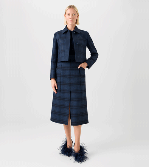ネイビーとブラックのチェック柄が印象的なショートジャケットとAラインスカートのコーディネート。ウールダブルフェイス素材で軽く暖かく、秋から冬にかけて活躍いたします。