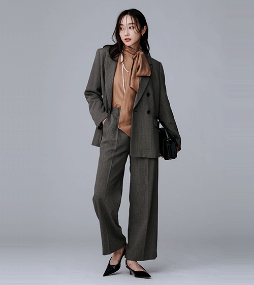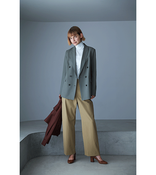 単品でもセットアップでも着られるダブルブレストジャケット。肩に重さがかからないよう計算されたフリーアーム設計でストレスフリーな着心地です。ご自宅でのお洗濯も可能でUVカットもある機能性の高い一着となっています。