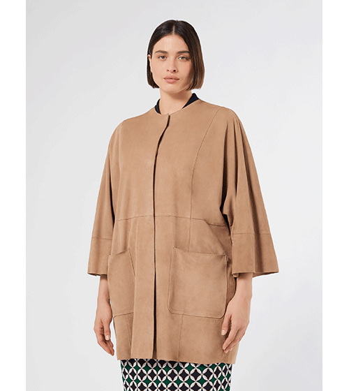 エレガントなムードと豊富なサイズバリエーションが魅力の〈マリナ リナルディ〉より、柔らかなやぎ革のナッパスエードで仕立てたノーカラージャケットをご紹介します。ゆったりとしたキモノスリーブで、快適な着心地です。