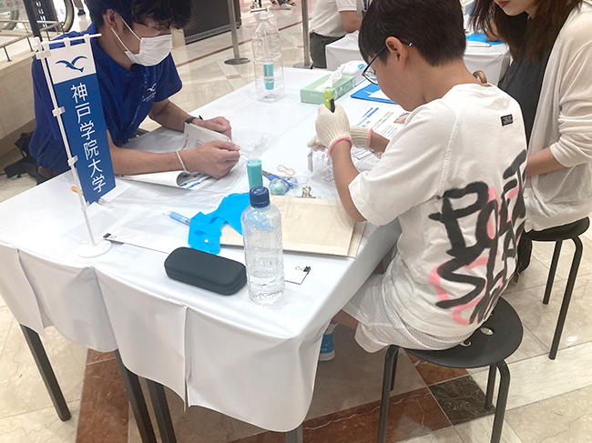参加者は、地震計の仕組みや揺れの周期について学んだ後、ペットボトルや粘土など身近な材料を使用して地震計と地震台を制作し、揺れの記録・観察を行いました。ペットボトルの側面を切る工程に少し苦戦する様子も見られましたが、学生たちのサポートによりすべての組が地震計を完成させることができました。