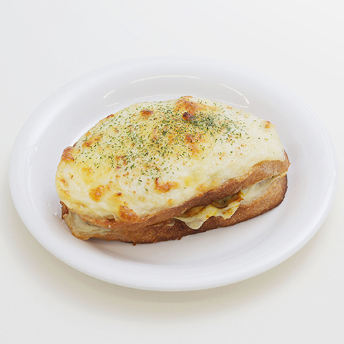 中にはベビーホタテとマッシュルーム。コクのあるチーズソースで仕上げたフルニエさん秘伝のクロックムッシュ。