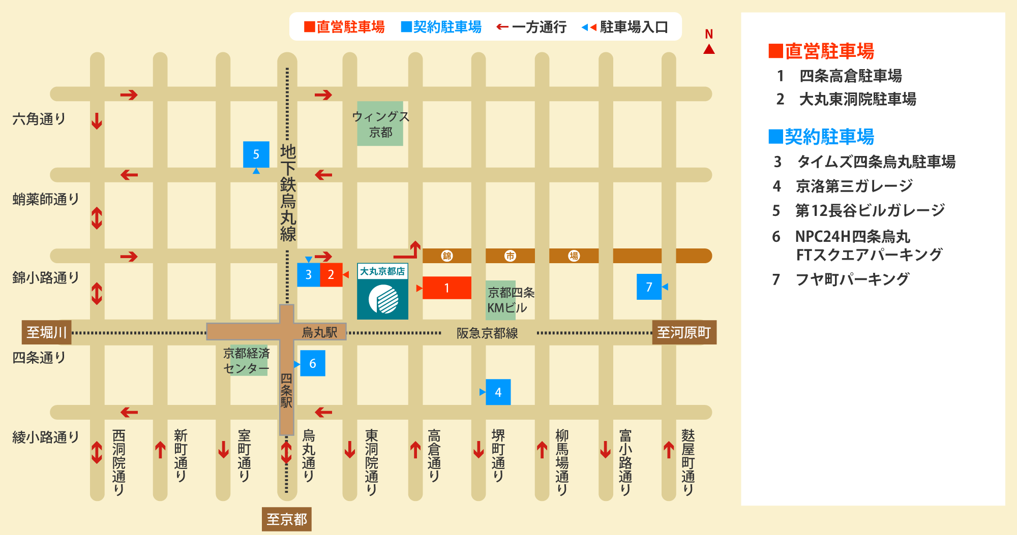 直営駐車場(下図 [1]四条高倉駐車場、[2]大丸東洞院駐車場