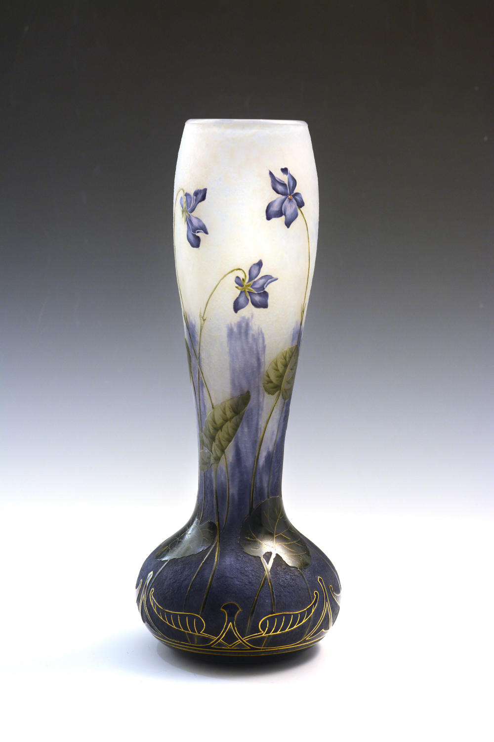 兄のオーギュストは1853~1909年、弟のアントナンは1864~1930年。繊細な花びらや葉脈まで描いた写実的な植物文と抽象的な金彩の対比は、ドームがしばしば使ったユニークな手法であり、菫のシリーズは特に高い人気です。