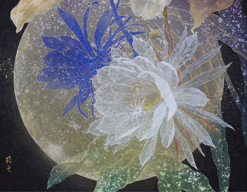 1990年生まれ。花々への造詣が深い母の影響で花々を中心に据えた作品を多く制作。画面に広がる綾のように重なり合った幻想的な世界は、人と四季との移りかわりを感じさせます。