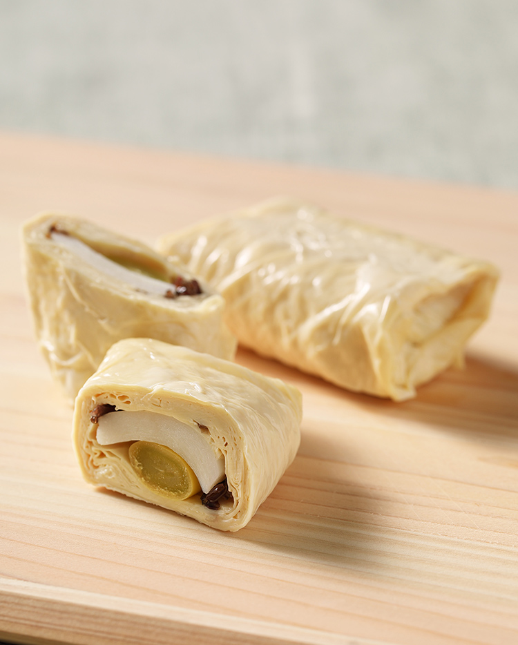 京都の名産のひとつとして知られる湯葉。中国から日本に伝えられ、京都でも精進料理や懐石料理といった食文化とともに育まれてきました。淡白でくせがなく、奥深いうまみをもつ湯葉は、炊いたり焼いたり揚げたり、幅広い料理に利用されています。湯葉弥は1830年に創業して以来、湯葉ひとすじ。水盆と称される京都ならではの名水と厳選した国産大豆を使用し、絹の布で濾した純度の高い豆乳から、一枚一枚、職人の手でそっと丁寧に引き上げて京湯葉を作っています。写真は、平湯葉で銀杏、きくらげ、百合根を包みこんだ「ゆば衣」です。写真1枚目は調理前、2枚目はだしと醤油、砂糖、酒でさっと煮た調理例。ほかにも、お吸いものや鍋ものに入れたり、そのまま素揚げにしたり、さまざまに味わっていただけます。切ると断面の彩りも美しく、それぞれの食材と湯葉が調和した豊かな風味が口の中に広がります。
