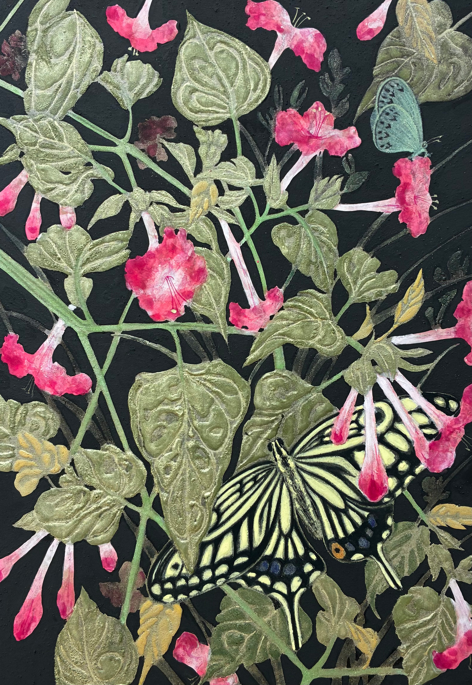 豊かな自然の中で生まれ育ち、子どもの頃の記憶と密接に結びつく自然の形象をモチーフに制作を続けています。モチーフや表現手法は経験を重ねていく作者自身と共に変化していき、現在も進行形であるようです。自分と向き合いながら続くひとり歩きの途中、その道程のような作品展をご覧いただきます。
