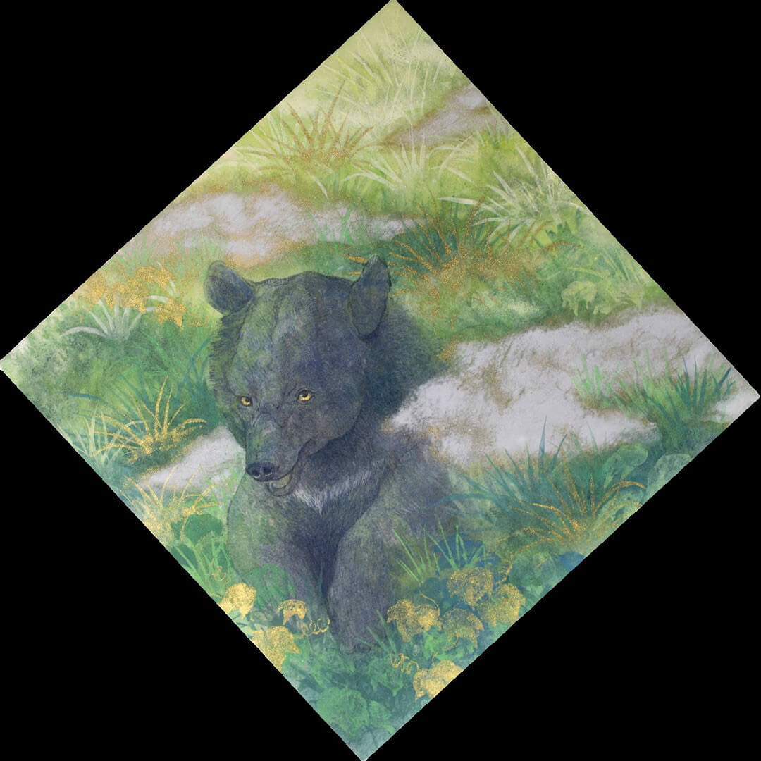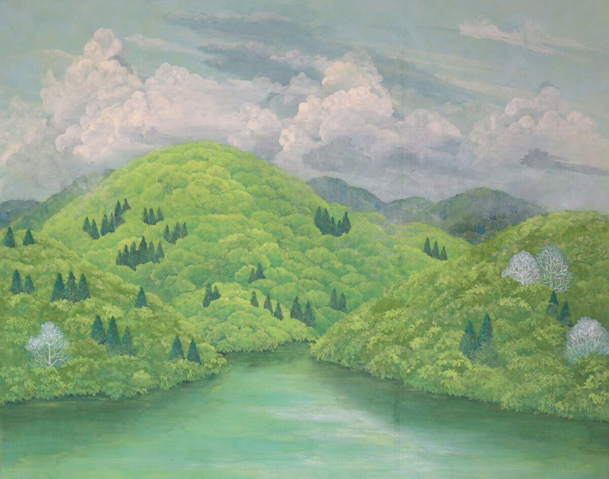 現在 京都府にて制作。おおらかな山の姿、森に住まう動物たちをのびやかなタッチで描きます。緑が芽吹き紅葉し落葉していく時間の流れを唱和するような作品をご覧いただきます。