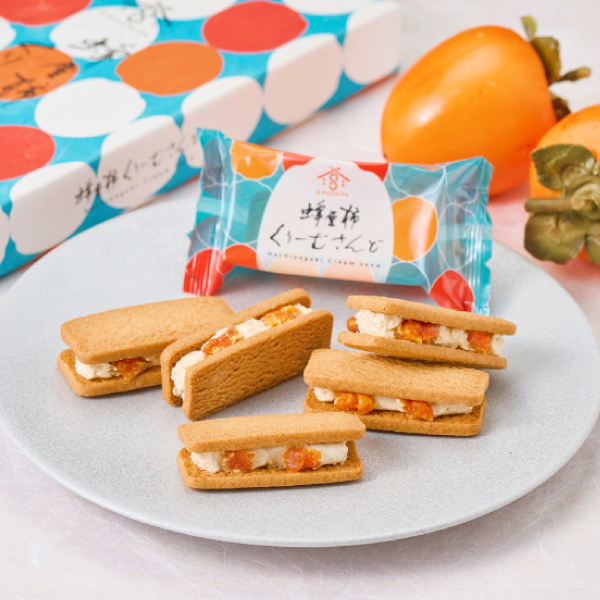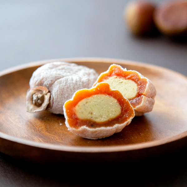 "歴史×革新。幻の柿を、スイーツに。"干し柿とホワイトチョコを練り込んだバタークリームをクッキーで挟み、仕上げに果肉感ある干し柿をトッピング。上品な甘さと味わいが広がる贅沢な一品です。