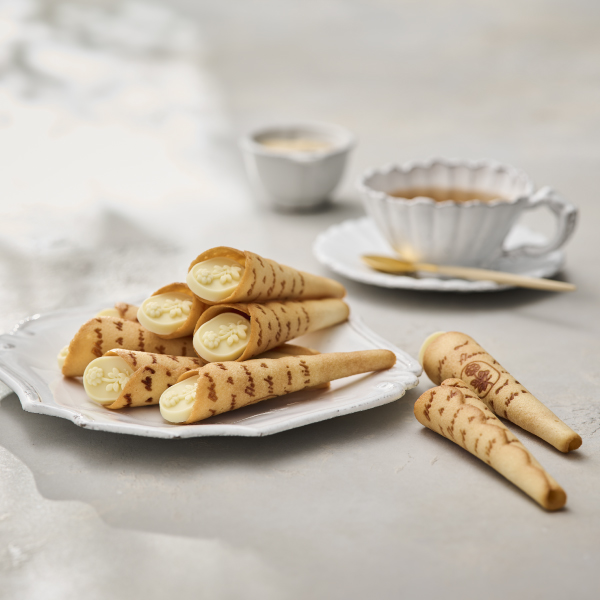 フランス産発酵バターが香るラングドシャと、ふんわりホワイトチョコクリームのやさしい味わいに、素焼きのアーモンドのアクセントが楽しい、ブーケの形をした焼き菓子です。