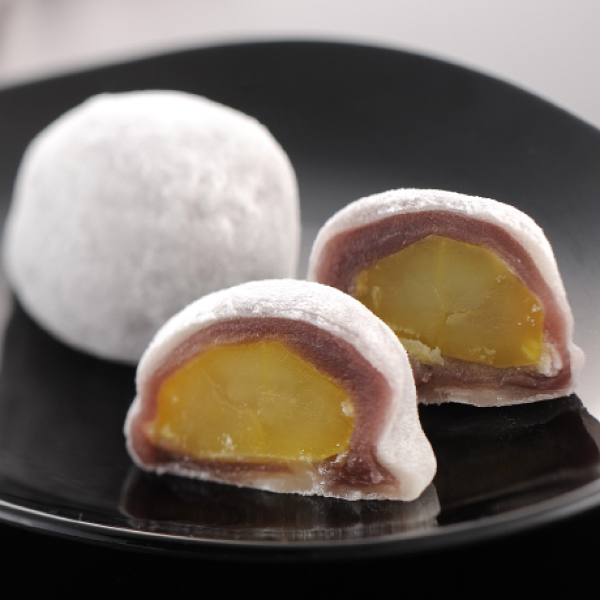 北海道十勝産の小豆を使った自家製のこし餡に栗を贅沢に一粒使用。羽二重粉と白玉粉を使ったお餅で包み込みます。