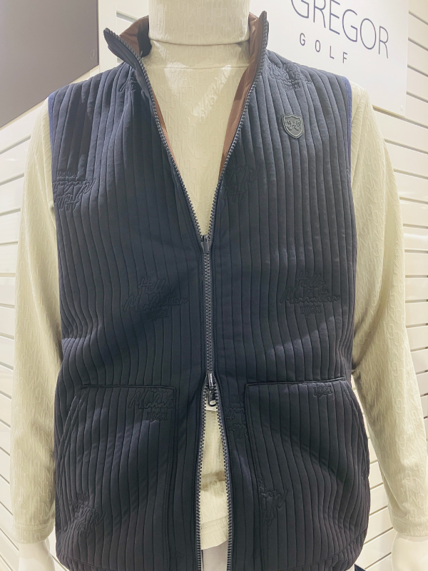 - キルト風ジャカードタフタのリバーシブルベストです。ネイビー、ブラウンの2通りの着こなしが楽しめる、〈マックレガーゴルフ〉おすすめのアイテムです。