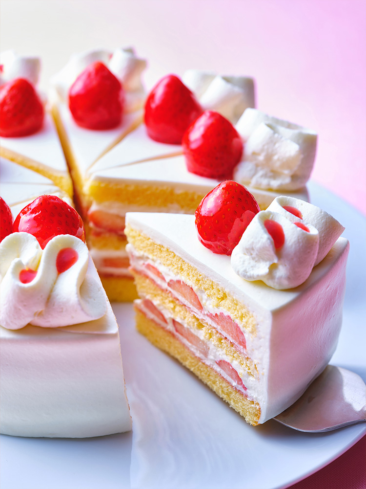 ハチミツ入りのしっとりスポンジケーキに、〈マールブランシュ〉大丸京都店でしか味わえない特製生クリームと苺をサンドしました。生乳のコクをいかした生クリームは、やさしくバニラが香るリッチなミルク感。クリームにちょんとのった苺ソースがアクセントです。長年愛される〈マールブランシュ〉の苺ショートケーキで大切にしている三位一体の口溶けはそのままに。