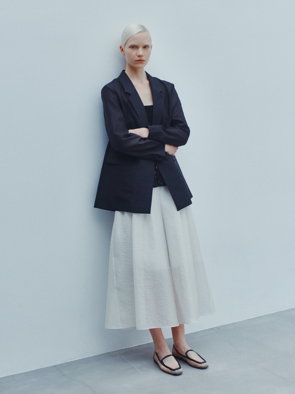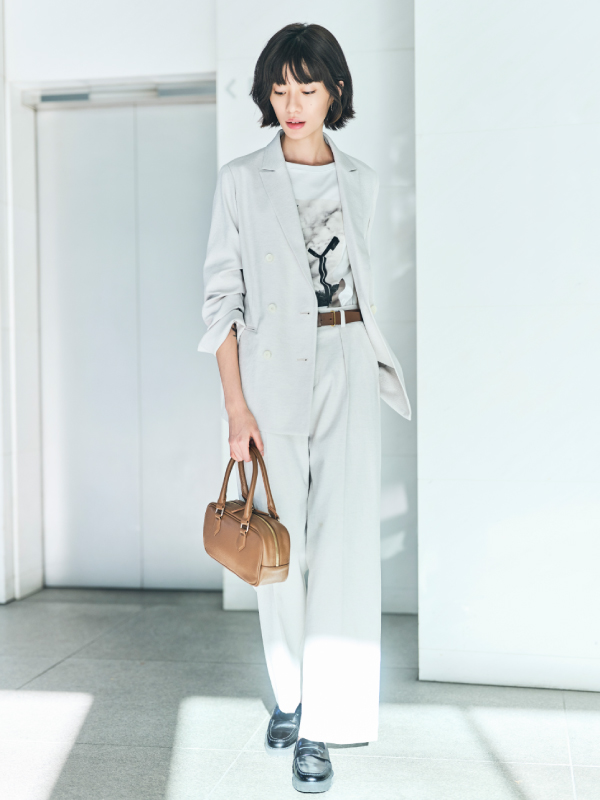- 独特の艶とシボ感が魅力のオーガンジー素材を使用したジャケットとパンツ。ややルーズなシルエットのテーラードジャケットに、ワイドシルエットのクロップドパンツを合わせ、スタイリングに立体感を演出。
