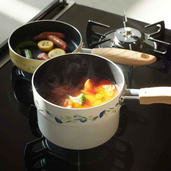 - フルールデュクールフライパン&鍋3点セット(深型ソースパン:高さ10cm/容量1.75L、ソースパン:高さ7cm/容量1.2L、フライパン:高さ4.2cm ※上記全て、直径15cm、取っ手の長さ13.3cm)税込6,600円