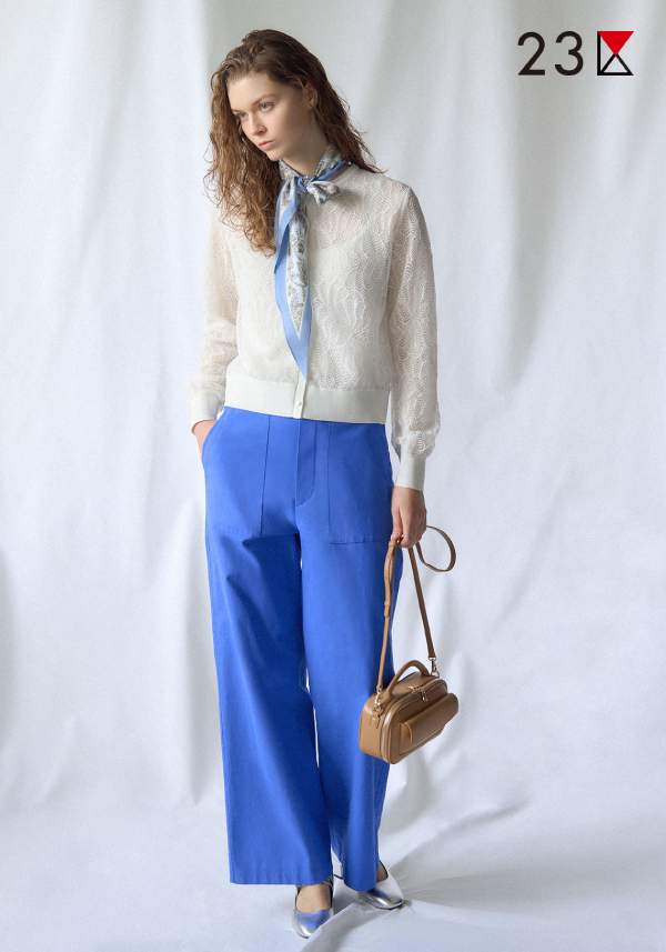 - リネンのナチュラルな表情とポリエステルの機能性を兼ね備えた23区オリジナル素材のワイドストレートシルエットのベイカーパンツ。快適な着用感で季節を問わず活躍する着回し力抜群なアイテムです。羽のモチーフからインスピレーションを受けて図案化した、緻密で繊細なレースがポイントのトップスとあわせて大人カジュアルなスタイリングを提案いたします。