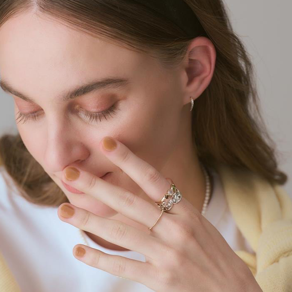 大小異なる3石を連ね、流れるようなラインを描くフォルムが魅力のリング。シンプルでありながら新鮮なカラーハーモニーを楽しめ、1本でも重ね着けでも、手元に清涼感をもたらしてくれます。