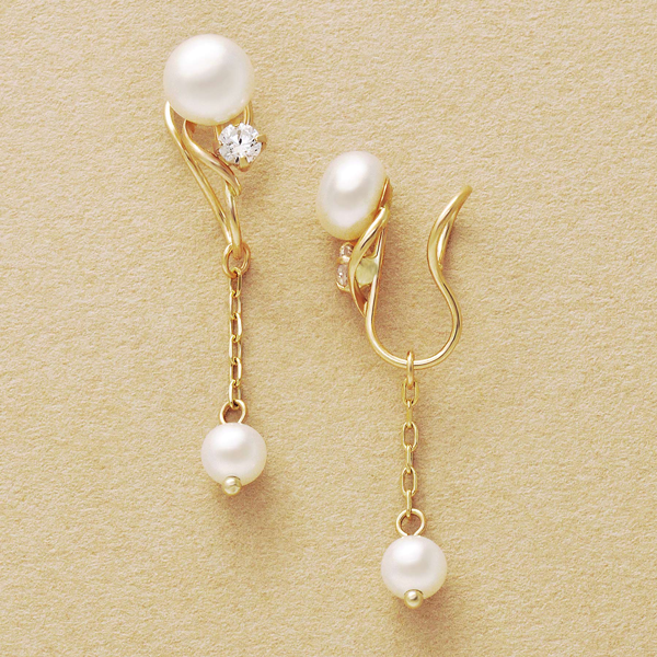 存在感のあるタンスイパールをメインに、キュービックジルコニアのきらめきと、つやめくイエローゴールドのラインを添えたイヤリング。着脱可能なパールのチャームは、ほどよいサイズ感で揺れ、目を惹きます。