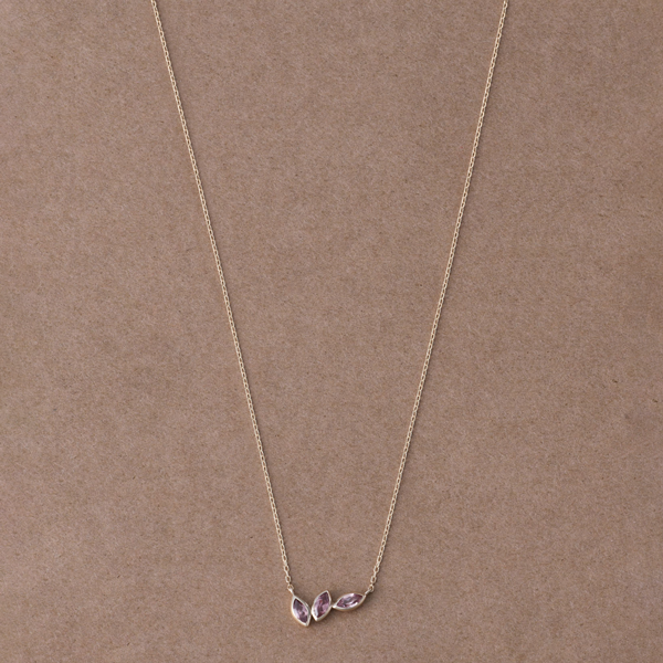 連なった小さなマーキスカットのマラヤガーネットが、ポインセチアの葉を思わせるデザイン。地金にはブランドオリジナルの“ロウブラウンゴールド”を採用。肌なじみが良く、こなれた印象をつくりあげます。