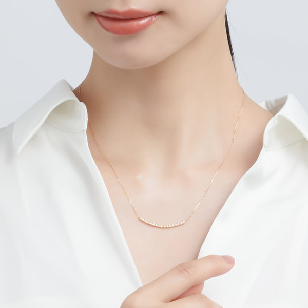 やわらかなU字ラインで、胸元を印象的に演出するバーデザイン。ダイヤモンドは、Hカラー、SIクラスのクラリティ、Goodカット以上の品質の中から厳選し使用。背面はツヤ感が美しい地金の仕立てにしており、装いや気分に合わせてリバーシブルでお楽しみいただけます。