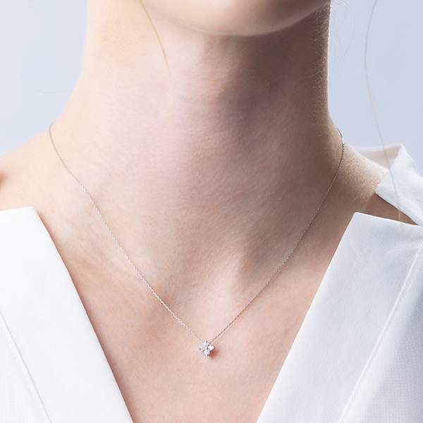 ノーブルな白い光で彩られたフラワーモチーフが、胸元をエレガントに演出するネックレス。美しいレースのような透かし模様が陰影を生み出し、奥行きのある表情を引き立てます。センターダイヤモンドから溢れる輝きがモチーフに華やかさをまとわせ、メレダイヤモンドのきらめきが柔らかなシルエットを際立たせます。日常のスタイルに、大人の女性にふさわしい上質感をもたらす一品です。