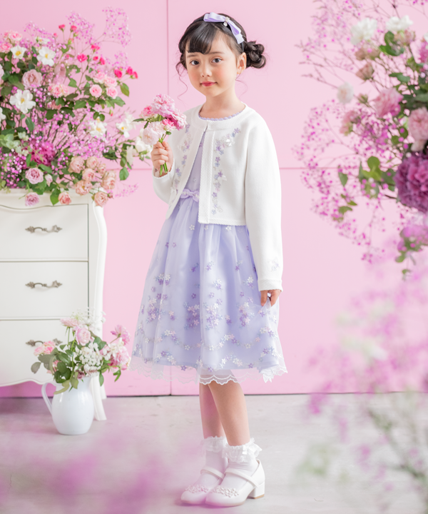オリジナルの繊細で美しいエンブロイダリーレースを全面にあしらったワンピースに、ハンドメイドのリボン刺しゅうでお花をデザインしたニットジャケットのコーディネートです。
