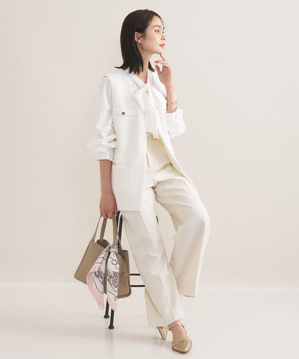 ツイードジレとボウタイブラウスがセットになった「いまどきハレの日スタイル」が時短で叶うアイテム。イベントシーンではキレイめなワイドパンツやギャザースカート、デイリー使いにはデニム合わせもおすすめです。