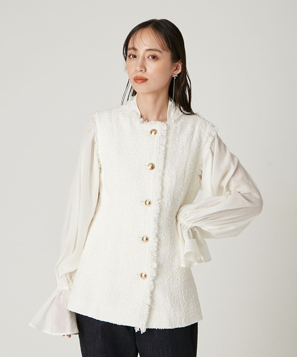 〈フレイID〉オリジナルツイードのジレ。繊細な光沢感を持つ上品な質感が魅力的。さらに、フロントに並ぶゴールドボタンや優美に広がるペプラムシルエット、ニュアンスのあるフリンジが華やかなムードを引き立てます。通勤や休日からハレの日まで、さまざまなシーンに活躍する一枚です。