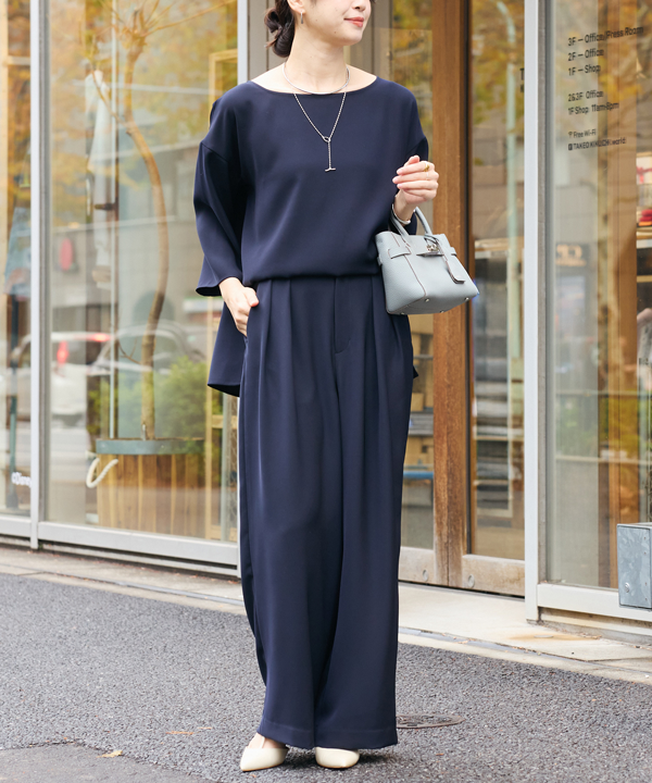 キレイ見えする素材感で、オケージョンや通勤にもぴったりなセットアップ。ブラウスは横に抜けた襟ぐりと、手首ののぞく袖丈で女性らしい抜け感のあるシルエットに。パンツはダブルタックで、ほどよく腰回りにゆとりがありながら、脚のラインをすっきり見せてくれるワイドシルエットです。しなやかな風合いのダブルサテンが、ハレの日にぴったりのアイテムです。