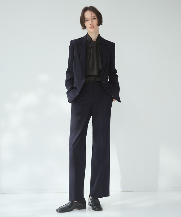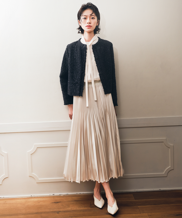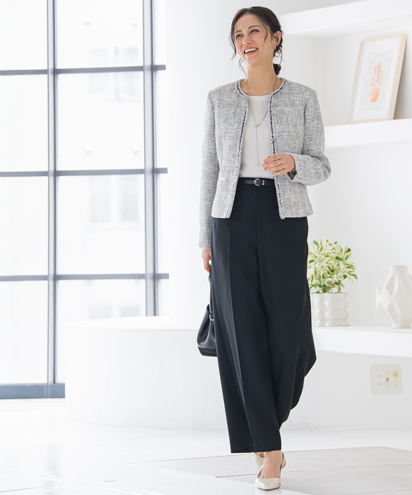 ストレッチ性を活かしたボディーラインを美しく見せてくれるツィードジャケットと、上品な落ち感の機能性ワイドパンツ。今年らしいハレの日スタイリングです。