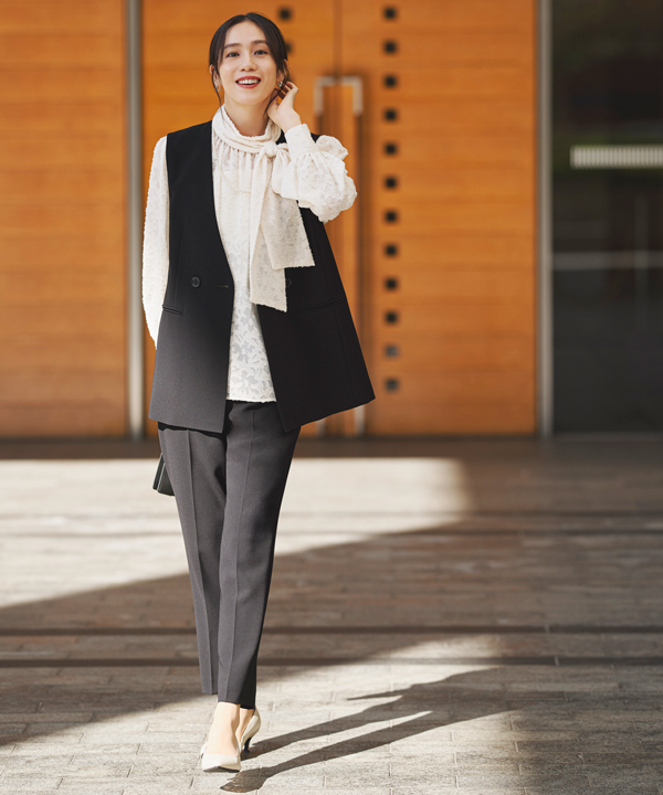 ジレは、カジュアルからオフィススタイルまで活躍するキレイめデザイン。いつものコーディネートを上品かつモダンに仕上げる一着です。