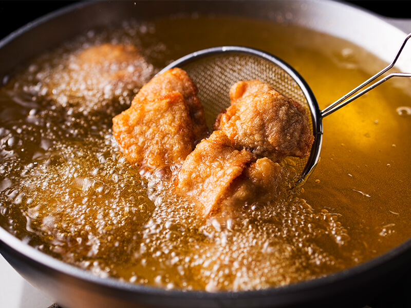 醬油をベースに、ニンニク・生姜・たっぷりの摺りおろしりんごを加え、約1ヶ月熟成させた秘伝醬油のタレ。 新鮮な国産若鶏をじっくりと漬け込み、北海道産馬鈴薯澱粉で旨みを閉じ込め、ジューシーに揚げています。