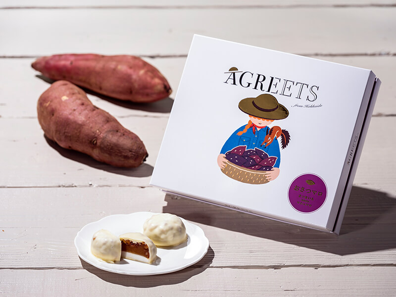 北海道初登場。ホワイトチョコレートと、キャンディングアーモンドの食感がまず心地いい。その後にやってくるのはふわりとしたマシュマロの甘み。そして最後に、蜜がとろっとした焼き芋をイメージしたさつまいも餡。気がつけば口の中いっぱいに大地の甘みが広がります。おさつマロ。北海道の新しいスイーツが、実りました。