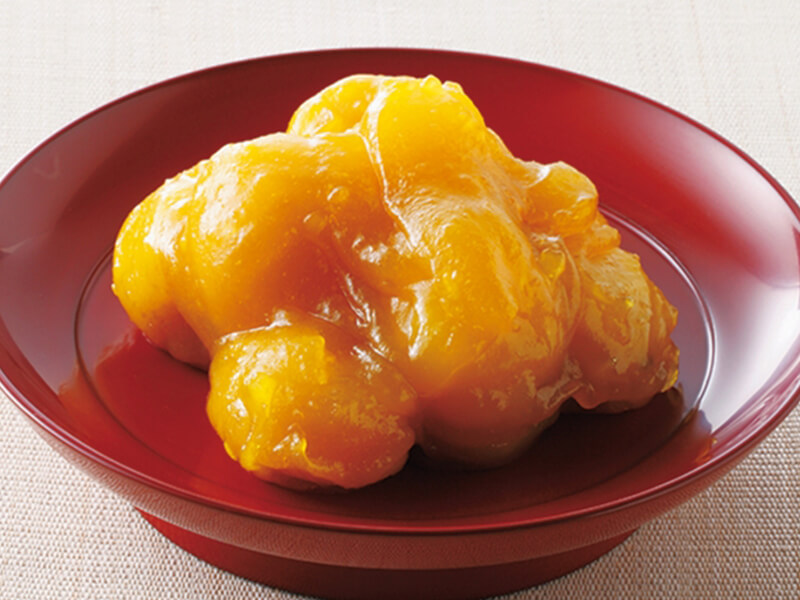 かつおだしの香りと昆布の旨味をきかせた、醤油ベースのたれに漬け込んだ味付数の子です。すっきりとした本みりんの上品な甘みで飽きのこない味わいに仕上げました。数の子は1本物、折物込を使用しています。