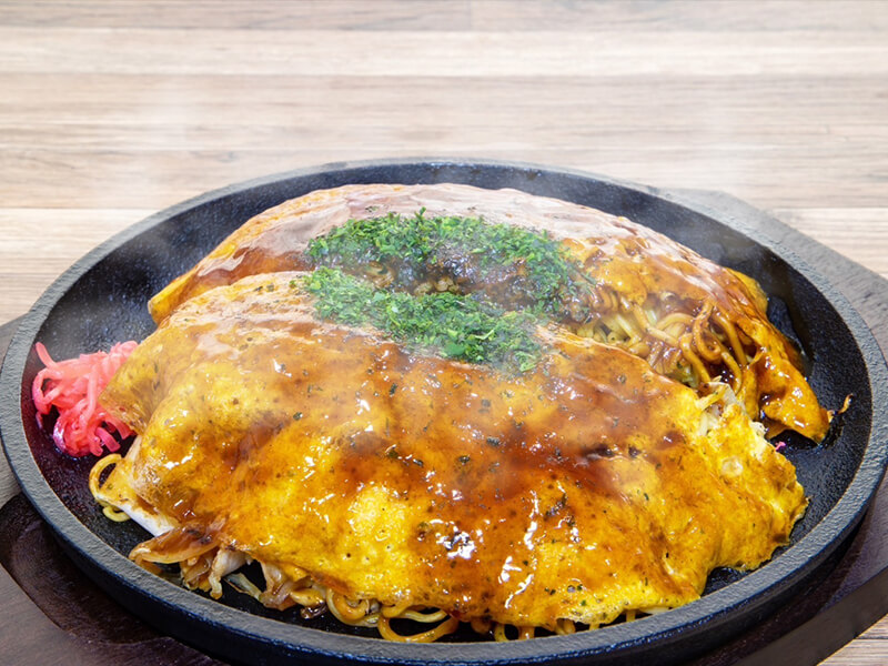 鰹だしをきかせた、たこ焼き生地で作るキャベツたっぷりのお好み焼きです。