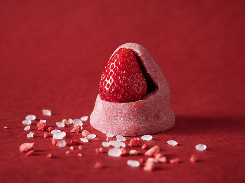 特別に製造した専用のつきたてお餅と、苺の甘さ、酸味のバランスを考えて、あえて少し高めの糖度で炊きあげた自家製こし餡を使用した苺大福。 使用する原材料全てを一からこだわり完成した〈えにかいたもち〉の苺大福をご賞味ください。
