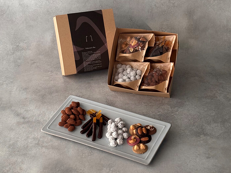 人気の「おやつシリーズ」のオランジェット、アマンドショコラ、ヘーゼルショコラ、マンディアンの4種をアソートに。バレンタイン商品として大丸札幌店先行販売です。