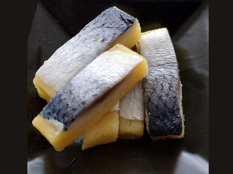 脂ののったにしんと固めたシシャモの卵を組み合わせ甘酢漬けにしました。食感の良さと後味の良いさっぱりとした味付けです。