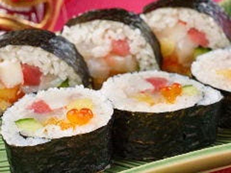 マグロ、ボタンエビ、ズワイガニ、ホタテ、イクラ、トビッコ、サーモン、数の子、卵焼き、キュウリの海鮮巻き。