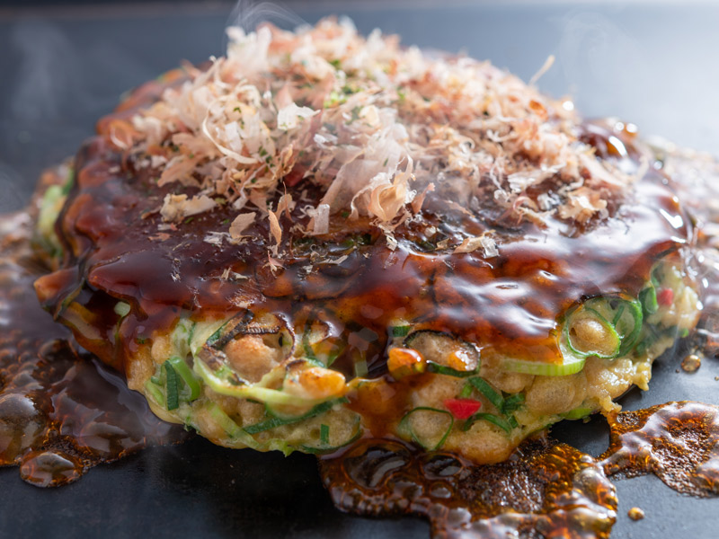 京都のお好み焼き店。卵と山芋をふんだんに使用した、ふわふわ食感のお好み焼き。生地に九条ねぎを混ぜ込み焼きあげました。九条ねぎのやわらかな食感と甘みが美味しいお好み焼きです。
