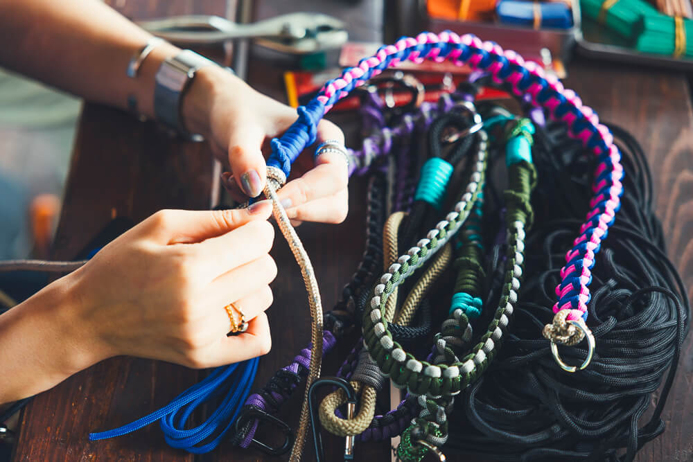「オンラインショップで売ってみたら?」という仲良しの友人からのアドバイスで、2022年から販売をスタート。当初シンプルだったデザインは、いつしか複雑なロープワークへと進化して、現在、1.2mのストラップに使われているロープの長さは、なんと30mにも及ぶのだとか!材料もアウトドアで使われるパラシュート用のパラコードから、テント設営時に使うガイロープ、岩場を登るクライミングロープまで多種多様に。どれも野外活動で使われる材料だけに、カラフルで丈夫、30mものロープが使われているとは思えないほどの軽さも特徴の一つです。