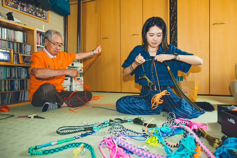 「ヒモを作ってみますね」と材料を並べてひとたび制作が始まれば、実家の和室は作業場へと様変わり。おしゃべりしながら迷いなくロープを編んでいく夏音さんと、黙々とロープを切る力雄さんの作業を見ながら、お母さまとおばあさまは「また散らかしちゃって」と苦笑い。とはいえ、和室の長押に作業途中のヒモがぶら下がっていたら、「お願いの合図かな?」と思って続きを手伝っておくのだとか。タレント・モデル業もストラップ製作も。夏音さんの活動を全力で応援してくれる家族のチームワークが、「kanonnohimo」を支えています。