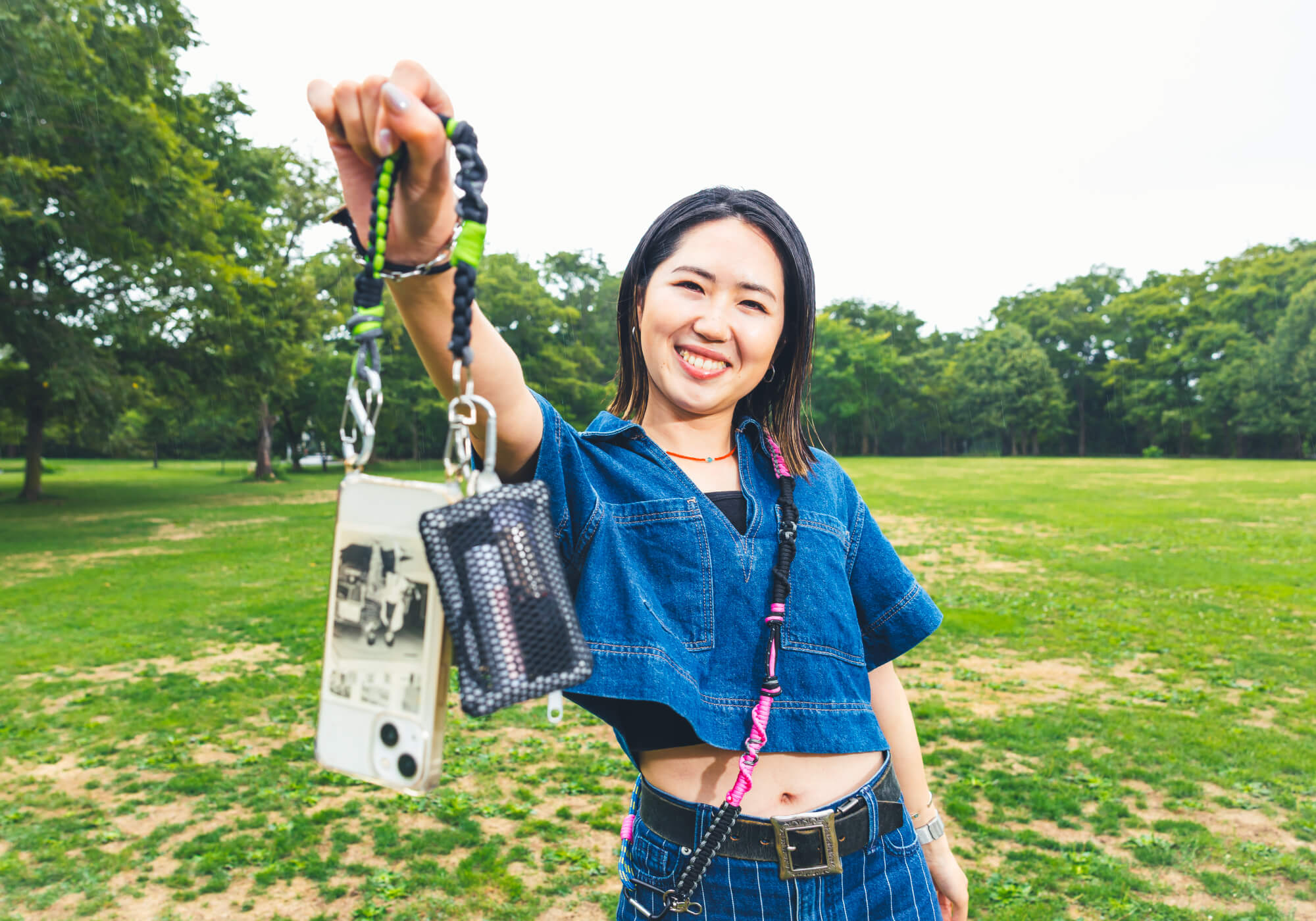 「桜とライラックが待ち遠しい」「ドラゴンフルーツ」「健康的なカエル」……。中村夏音さんが主宰する「kanonnohimo(カノンノヒモ)」のオンラインショップには、お茶目な商品名が付いたストラップが並んでいます。一本の中に数種類のロープワークが施されており、メタリックなクール系から、ネオンカラーのPOP系、ビタミンカラーのアウトドア系まで、すべてがカラフルなロープで手作りされています。どんなシーンで使おうか、どんなファッションに合わせようか、どの一本を迎えようかと悩む時間さえも気分がウキウキしてくるのは、同じデザインがない一点物だから。